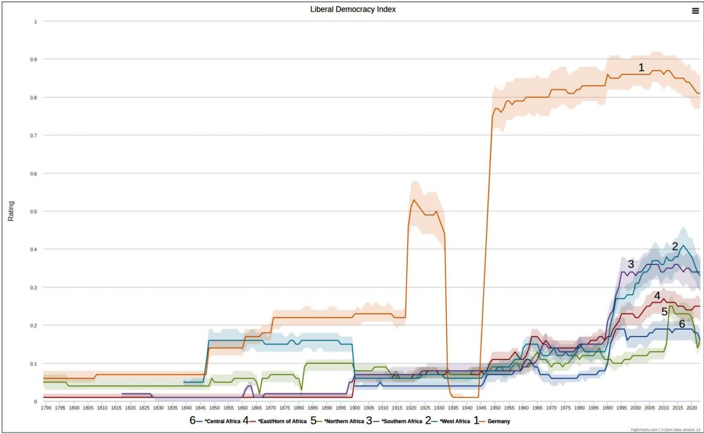 17 Es stellt sich hier aber auch die methodische Frage, inwieweit das V-Dem Institut für diese Zeitphase in diesen Regionen Afrikas überhaupt brauchbare Daten besitzt.