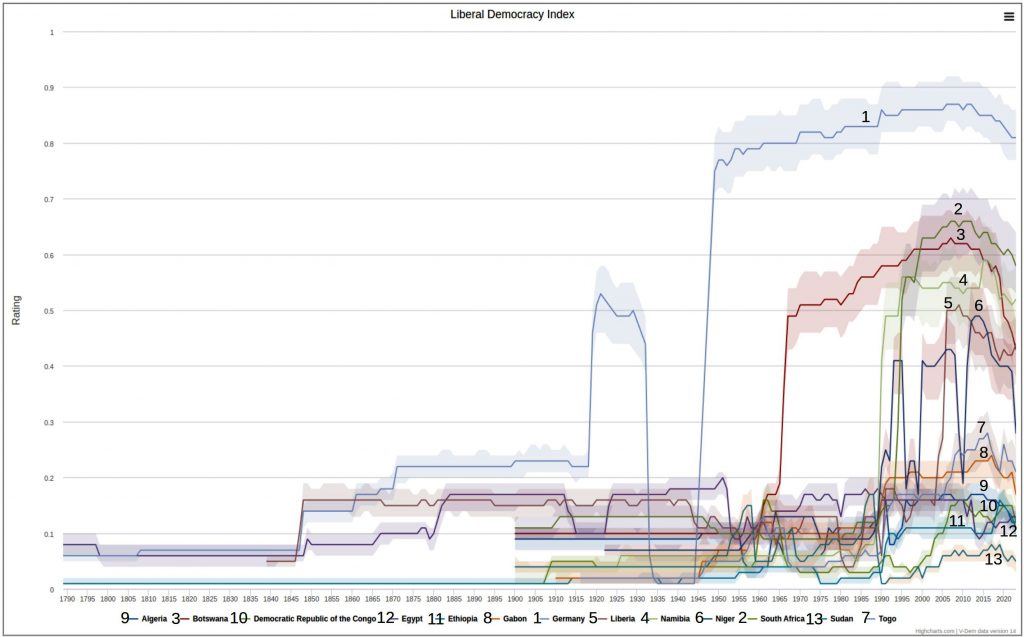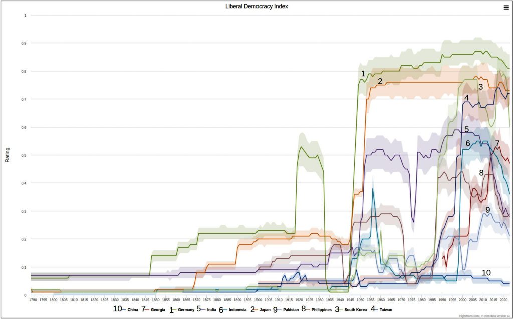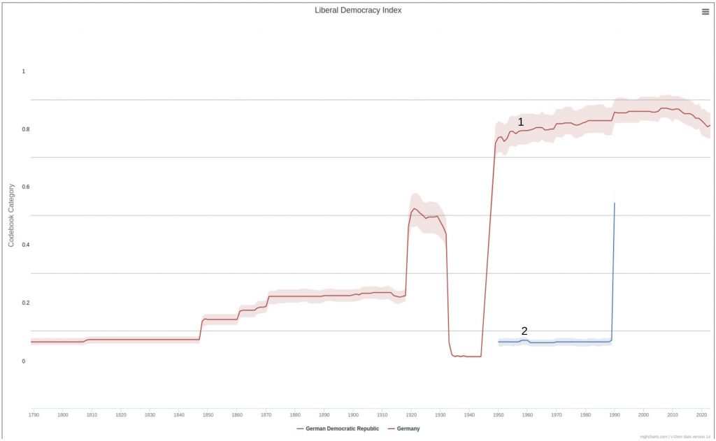 Das Interessante an diesem Schaubild ist, dass die Kurve auf der Seite der interaktiven Graphiken von jedem abgerufen werden kann.11 Gibt man links bei Indizes ‚Liberal Democracy Index‘ ein, bei Land ‚Germany‘, und bei Zeitskala 1789 – 2023, dann erscheint die Linie für Deutschland. Ergänzt man als zweites Land ‚German Democratic Republic‘, dann erscheint zusätzlich die zweite kürzere Linie.