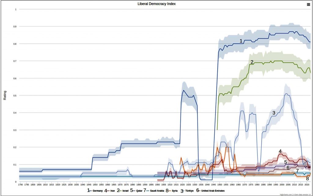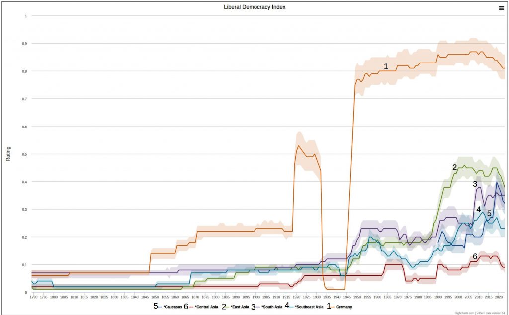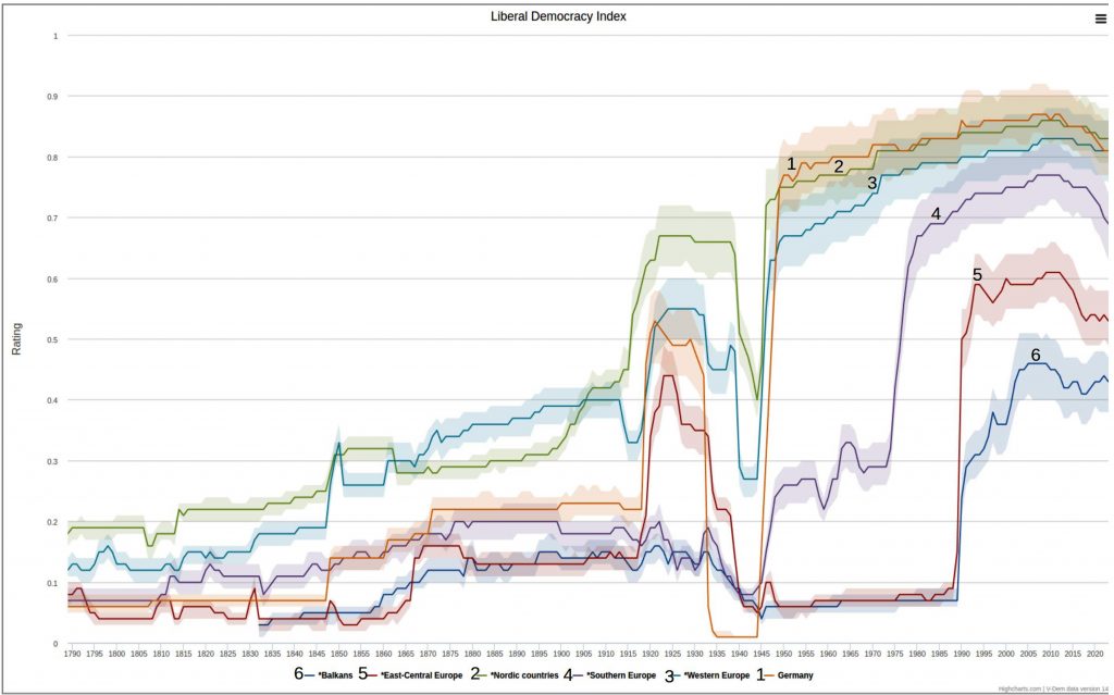 Diese Kurven besagen, dass die Experten des V-Dem Instituts für alle (!) diese Zeitpunkte mit den doch jederzeit sehr unterschiedlichen Verhältnissen, ihre ‚Kriterien für Demokratie‘ abgeglichen und dann bewertet haben. Ihre ‚Bewertungen‘ kann man links als Index zwischen ’0‘ und ‚1‘ ablesen. ‚1‘ steht für 100%. Das Erstaunliche ist, dass es deutlich erkennbar ‚Phasen‘ gibt, in denen der Bewertungsindex einigermaßen konstant ist. Auf’s Ganze gesehen nimmt dieser Index zu: von ungefähr 1% in den 1790-iger Jahren bis hin zu 80-85% ab den 1990-iger Jahren. Ein eklatanter Einbruch zeigt sich nur in der Zeit von 1933 bis 1945. Natürlich kann man sich fragen, was in den verschiedenen zeitlichen Phasen denn in dem Gebiet, was zu der jeweiligen Zeit ‚Deutschland‘ genannt wurde, ‚los war‘?