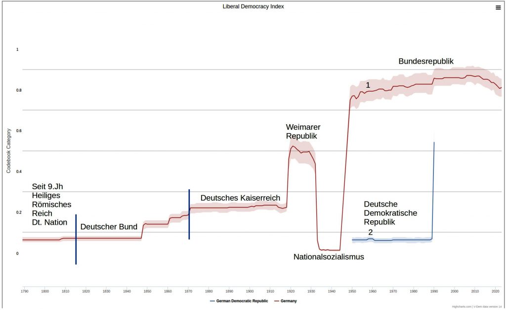 Während die V-Dem Experten in der Zeit des ‚Deutschen Bundes‘ eine Ausprägung von 10-20% in Richtung ‚liberale Demokratie‘ feststellen können, liegt diese Ausprägung im Deutschen Kaiserreich bei 22-23%. Die Weimarer Republik erreicht Werte um 51-61%. Die Zeit von Nazi-Deutschland bekommt Werte von ca. 1%, was einem Extremwert gleich kommt. Die Bundesrepublik ab 1949 startet mit Werten um 75%, die sich in den 1960iger Jahren auf 80% erhöhen und später zwischen 80% und 85% pendeln.