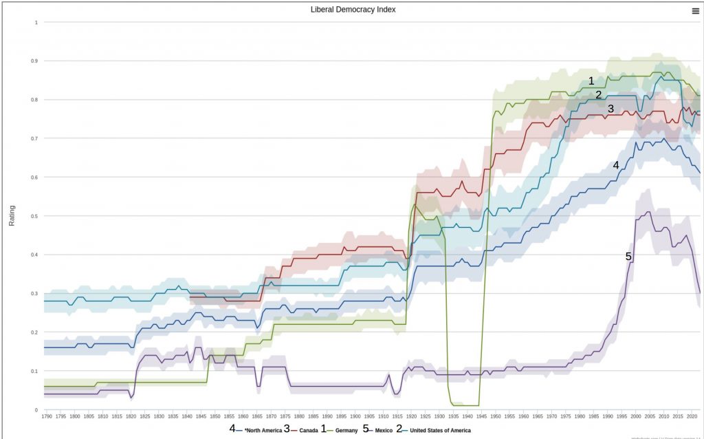 Im direkten Vergleich mit Deutschland fällt auf, dass die Demokratie-Ähnlichkeit von Deutschland bis 1918 deutlich niedriger war als in den USA und Kanada (aber teilweise deutlich höher als in Mexiko), dann aber während der Weimarer Republik die USA sogar übertraf. Während des Nazi-Regimes stürzte Deutschland ins Bodenlose ab, konnte dann aber nach dem Krieg durch die unmittelbare Unterstützung seitens der USA, des Vereinigten Königreichs und Frankreichs sehr schnell an das Ausmaß der Demokratie-Ähnlichkeit nicht nur anschließen, sondern konnte die USA und Kanada sogar übertreffen.