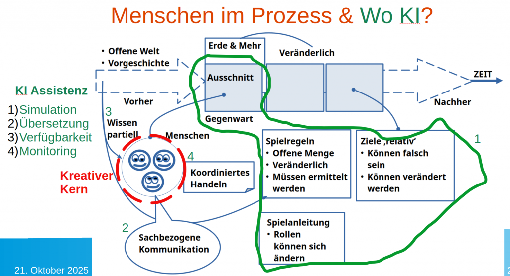 Eine gewisse Chance des Nachdenkens über ‚Mensch & KI‘ besteht darin, sich auf jene Strukturen zu besinnen, die uns allen gemeinsam sind: die konkreten Situationen des Alltags, in die wir mit unserem Körper eingebunden sind, und wo sich auch alle anderen unausweichlich befinden. Selbst wenn sich jemand unter’KI‘ zunächst nichts vorstellen kann, wenn es eine KI gibt, die im Kontext des Alltags ‚Wirkungen erzielt‘, dann hat man gemeinsame überprüfbare Anhaltspunkte, über die wir reden können.
