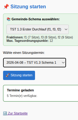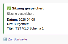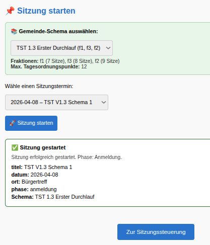Der Start der Sitzung wird bestätigt mit Angabe von Datum und Ort der Sitzung sowie unter Angabe des gewählten Schemas.