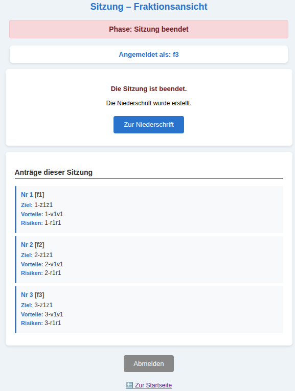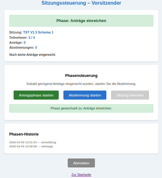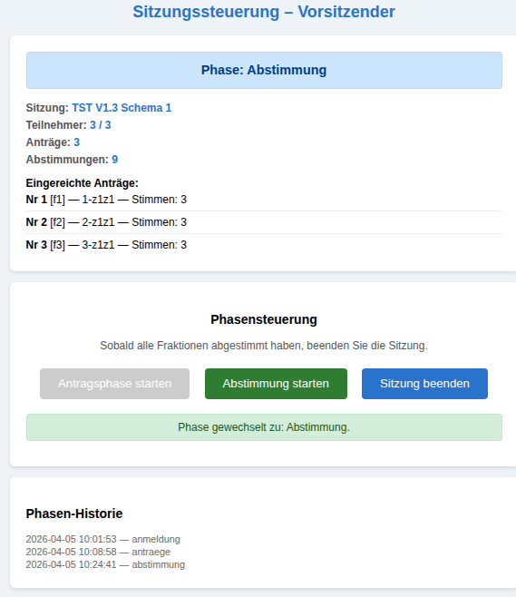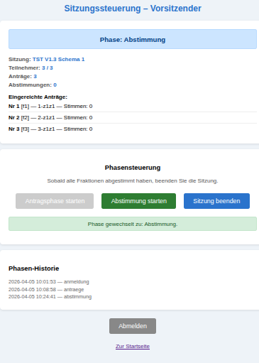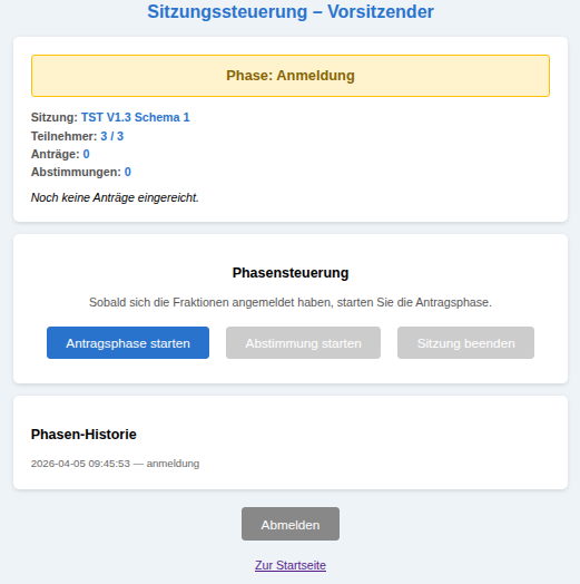 Im oberen Feld ‚Phase : Anmeldung‘ sieht er, wie viele der möglichen Fraktionen (hier: 3) sich bislang angemeldet haben (hier: 0). Zusätzlich sieht er, wie viele Anträge bislang eingereicht wurden und wie viele Abstimmungen vorgenommen wurden.