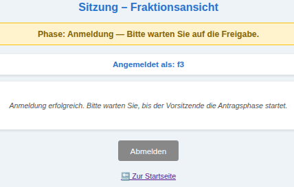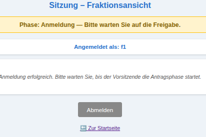 Falls sich die beteiligten Fraktionen individuell mit ihrem Browser schon angemeldet haben, bevor der GV-Vorsitzende eine Phase aktiviert hat, haben sie keine Aktionsmöglichkeit. Sobald der GV-Vorsitzende dann eine Phase anklickt verändert sich der Bildschirm der Fraktionen und wird für die Phase aktiv, die der Vorsitzende angeklickt hat.