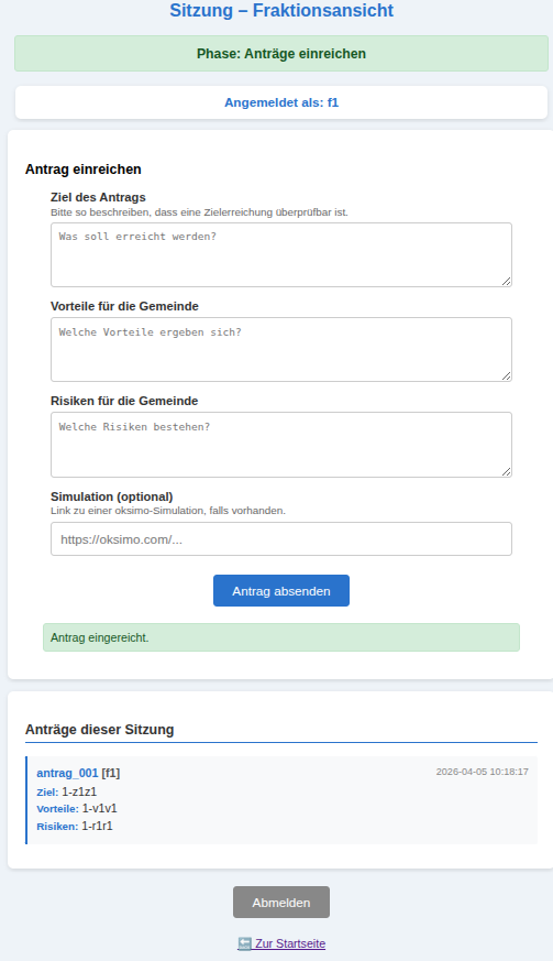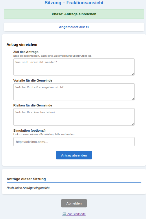 Am Beispiel der Fraktion f1 kann man sehen, wie durch den Start der Antragsphase der Bildschirm sich geändert hat.