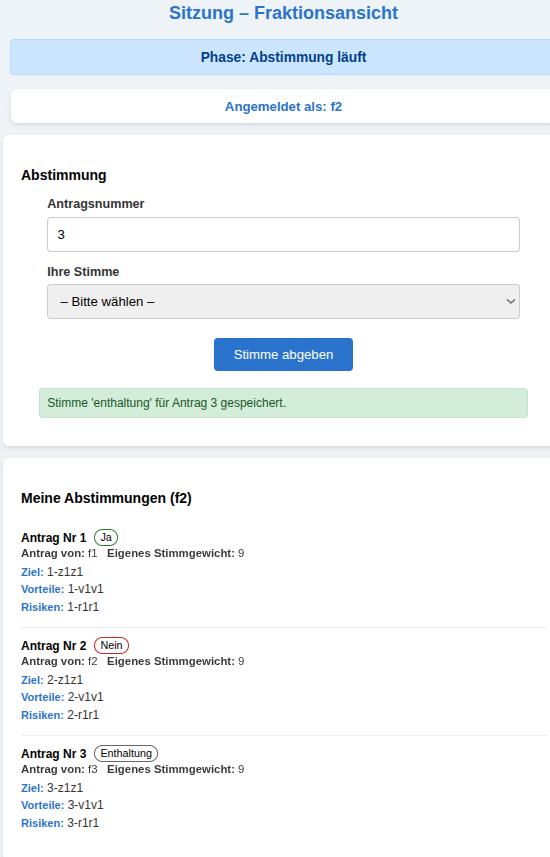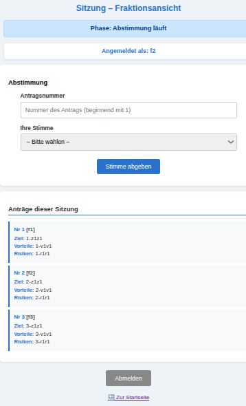 Am Beispiel von Fraktion f2 kann man sehen, wie sich der Bildschirm für die Abstimmungsphase geändert hat.