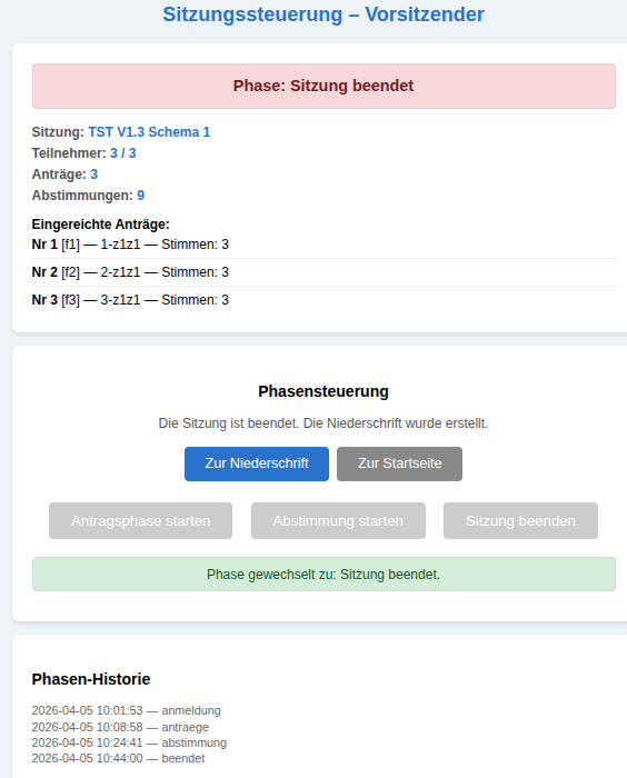 Damit kann er die Sitzung beenden und eine Niederschrift der gesamt Sitzung anfertigen lassen.