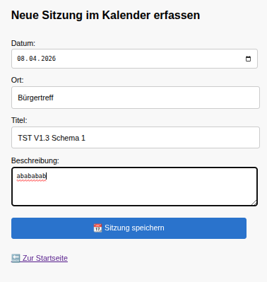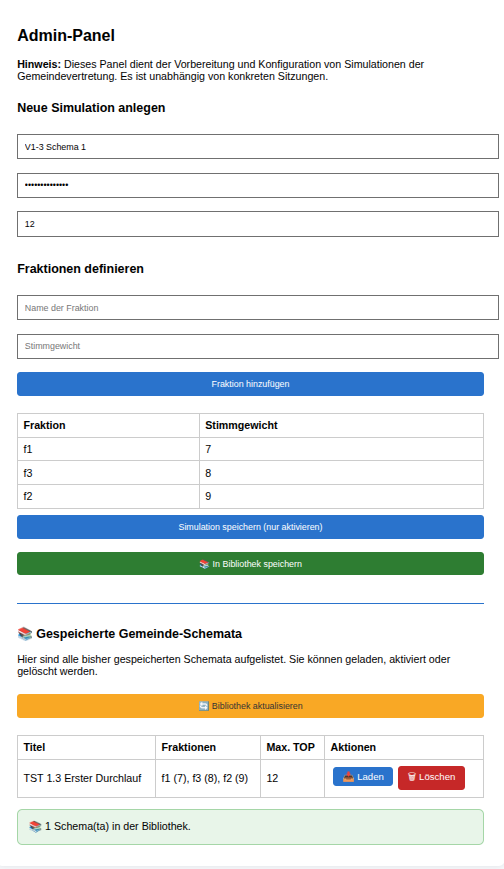 In diesem Text wird nicht ein ganzer Durchlauf komplett dargestellt sondern nur jene Aspekte, die sich von Version 1.2 unterscheiden. Dies betrifft das Speichern neuer Schemata durch den Administrator und die Möglichkeit der Auswahl verschiedener Schemata bei der Terminvereinbarung und dem Start einer Sitzung durch den GV Vorsitzenden. Alles andere ist wie in Version 1.2.