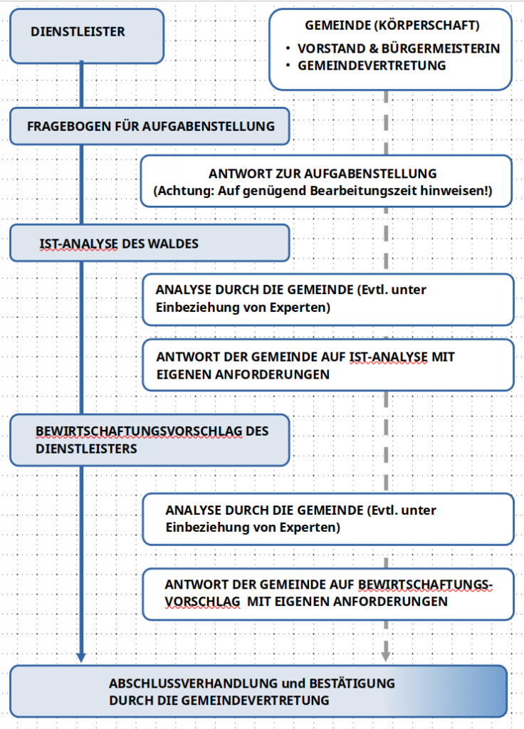 Wenn die Gemeinde als Eigentümerin spezielle Anforderungen für ihren eigenen Wald fordern und umsetzen will, dann müssen diese seitens der Gemeinde erarbeitet und im Rahmen der Verhandlungen mit dem Dienstleister eingebracht werden.